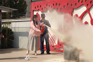 演练结束后,消防指战员现场为师生带来干货满满的消防技能培训。消防员细致讲解灭火器的工作原理、适用场景与操作步骤,通过 “提、拔、握、压” 的规范演示,让大家清晰掌握使用要领。随后,在消防员的保护与指导下,教师代表依次上前实操体验,亲手操作灭火器扑灭模拟火点,切实将理论知识转化为实战技能。